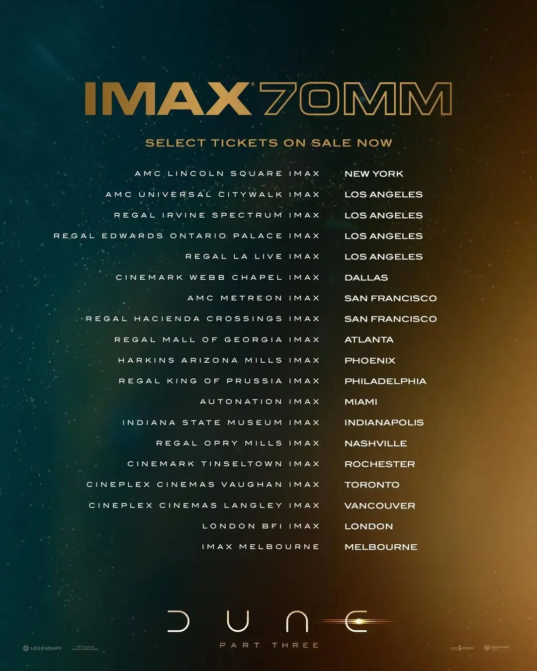 上周,华纳突然放出了《沙丘3》70mm胶片IMAX影厅的首批预售票,尽管距离影片在北美上映(12月18日)还有8个月的时间。