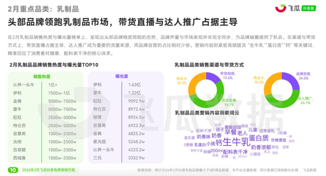 另据飞瓜数据,2月乳企品牌在抖音营销端的投入力度显著增多,主要集中在直播与达人推广层面。2月适逢春节,乳企的营销预算倾斜是希望在春节带动销量。