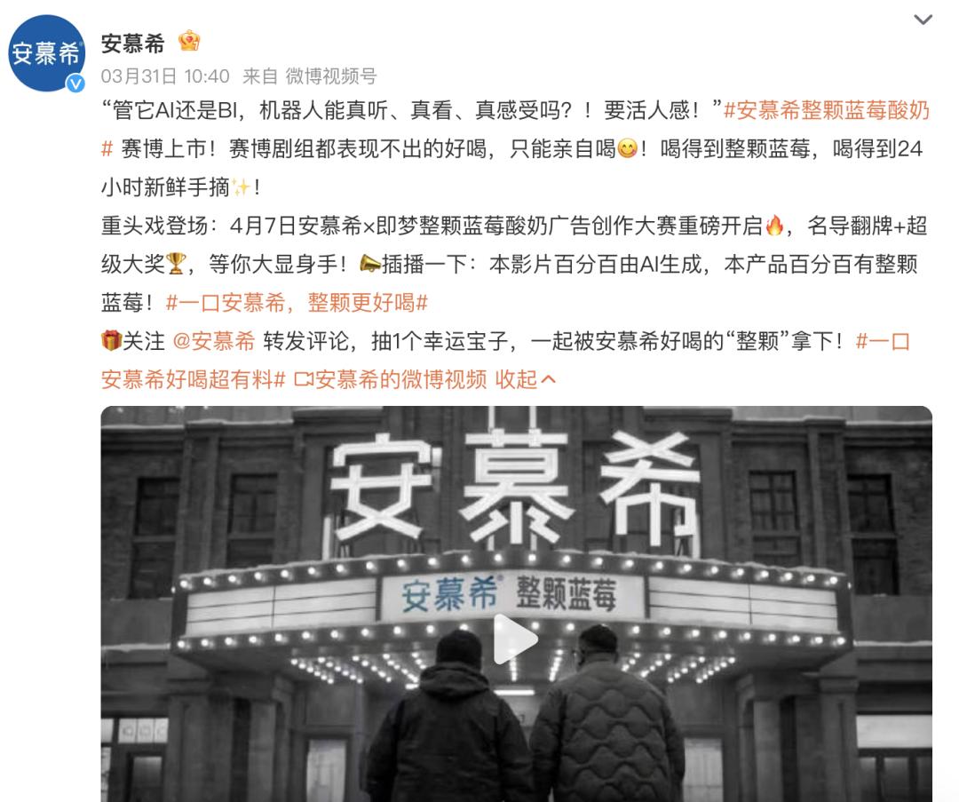 除此之外,安慕希联合即梦AI、抖音,共同发起整颗蓝莓酸奶AI广告创作大赛,以AI内容做新品认知。活动不仅设立高额奖金,还邀请知名导演贾樟柯做点评。