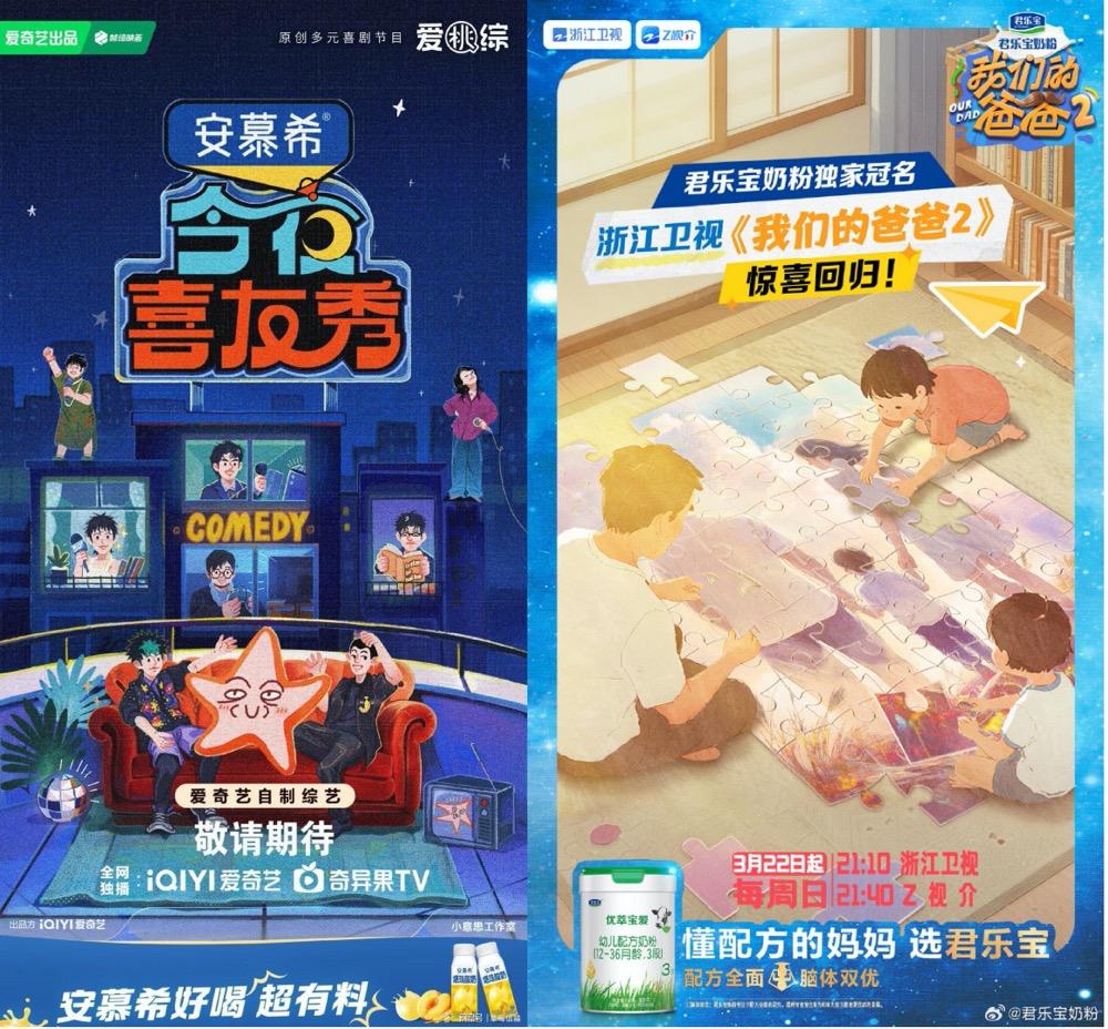 TOP君结合公开信息梳理发现,截至发稿,乳企综艺赞助呈现明显分化:安慕希独家冠名爱奇艺《今夜喜友秀》,聚焦轻量化喜剧内容;君乐宝保留垂类综艺如《我们的爸爸第二季》,重点围绕奶粉、儿童线做场景化曝光;而金典、纯甄、特仑苏目前均未查询到任何综艺赞助。
