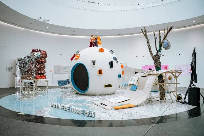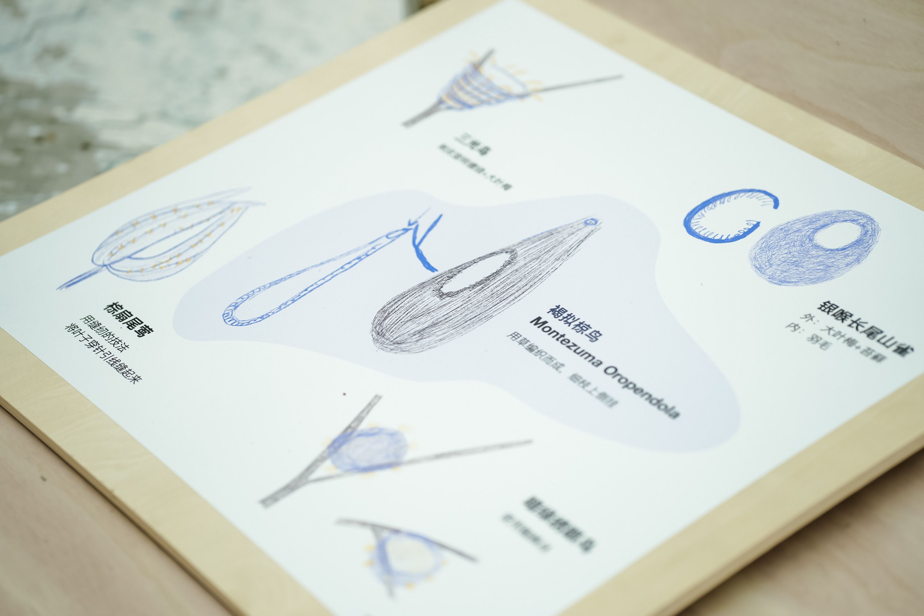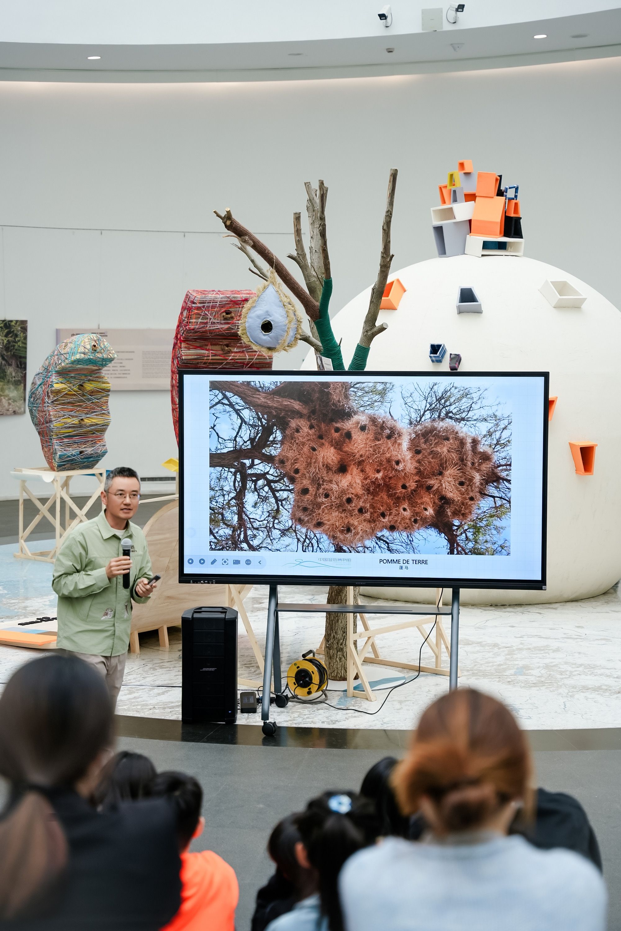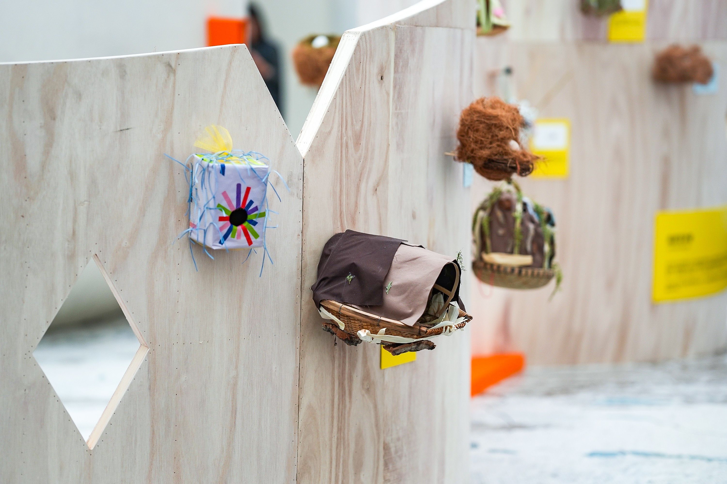 展览空间以湿地为灵感,划分为多个功能区域。中心装置是一座由蓬马库存面料拼接而成的可进入球形鸟屋,大小蓬友们可以走进鸟屋内学习观鸟相关知识、了解湿地生态。艺术家合作区域使用真实树木悬挂艺术家手作鸟屋,呈现自然与艺术的共生之美。小蓬友手作展示区中,3月28日工坊完成的作品悬挂于墙面,记录孩子们的创作轨迹与守护心愿。大型鸟屋打卡区则以偏自然形态的鸟窝为设计灵感,成为展览最具代表性的拍照打卡点。