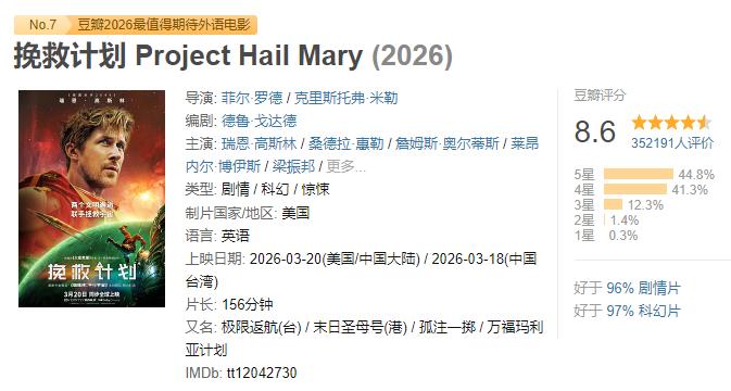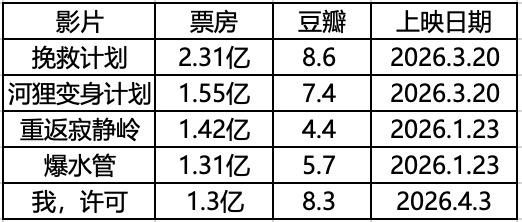 从2026年票房榜单可以明显看出,去掉春节档影片之后,目前今年票房榜前三均被引进片所霸占。其中《挽救计划》大超预期,不仅拿到了豆瓣8.6分的神级水准,市场走势也是斩获长线表现,目前来到了2.3亿+的量级,预计最终将落在2.6亿的体量。显然这并非传统意义的好莱坞爆米花大片,但依然凭借过硬水准拿到了优异的表现。
