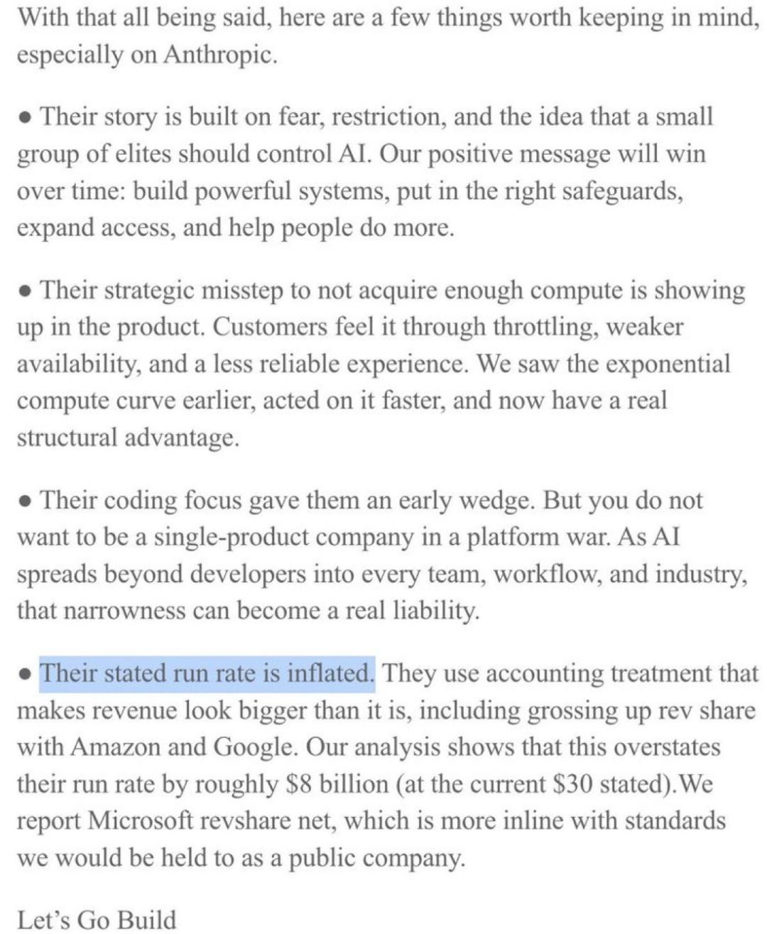 但是在这份备忘录中写到,Anthropic的年化收入中,80亿美元是通过会计处理手段“虚增”出来的,也就是说他们的年化收入应该在220亿美元。没有超过OpenAI的250亿美元。