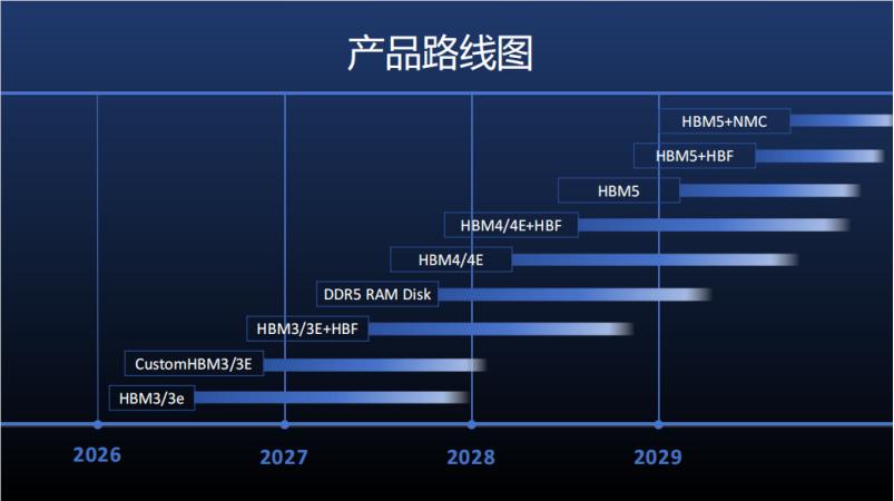 从技术演进看,HBM仍在快速迭代。公司披露的产品演进路线显示,2027年将推出定制版HBM及HBM+HBF融合架构,面向大模型推理提供TB级容量方案;2028年计划推出HBM4/4e,单颗带宽提升至2.5TB/s;2029年规划推出HBM5及存内计算产品,探索“计算靠近数据”的架构方向。