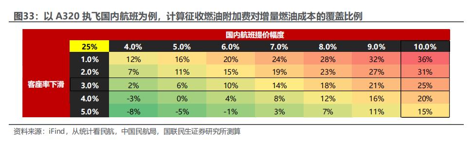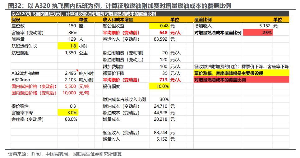 但在实际运营中,由于下游提价传导有限,航司需要在旅客量下滑和含附加费全票价提升之间寻求平衡,征收附加费对增量成本的净覆盖比例约为20%-30%。