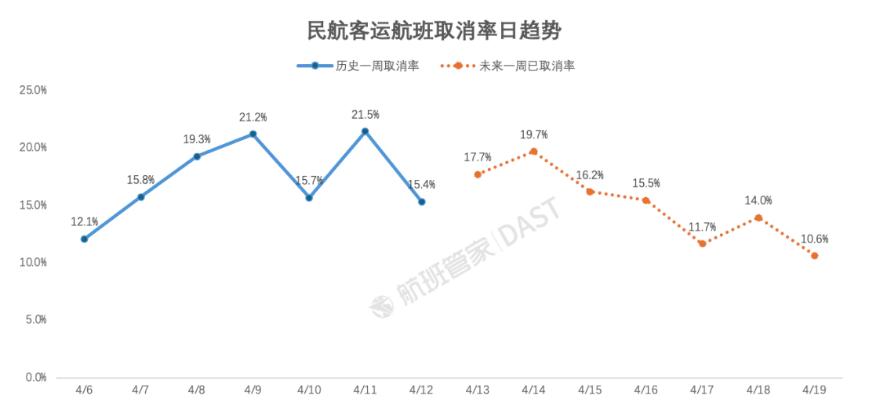 航班管家 DAST 数据显示,截至4月12日,未来一周(4.13-4.19)全国民航客运航班取消率已达15.1%,环比前一周虽回落2个百分点,而这只是当前计划取消率,随着时间推移,取消率还会继续上升。