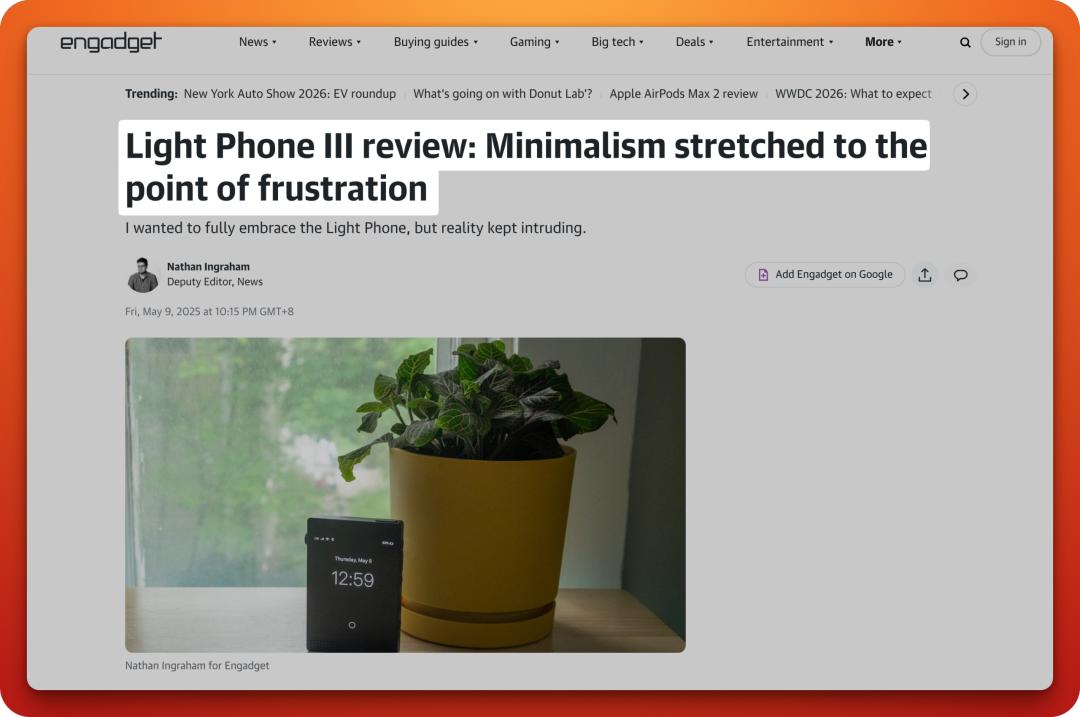 海外媒体是这么评价 Light Phone 三代的:「极简主义被拉伸到令人沮丧的程度」,「一台越来越像智能机的傻瓜手机」。也不能怪他们:AMOLED 屏幕、摄像头、NFC 支付、指纹解锁……只看参数表的话,你很容易以为这就是一台智能机。