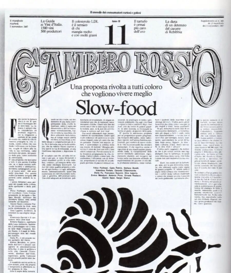 1987 年,意大利餐饮指南头版刊登「慢食运动」宣言