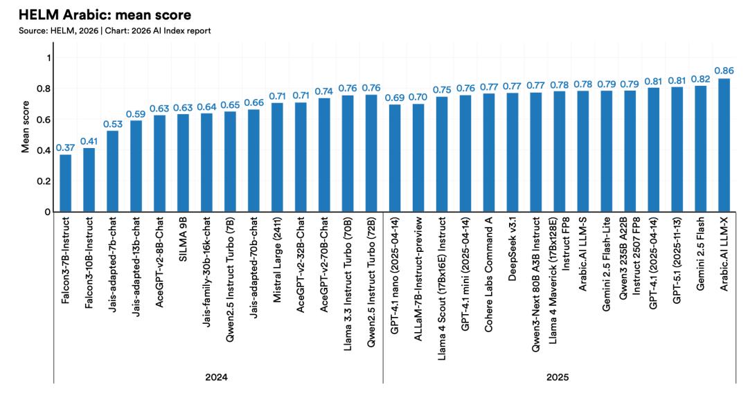 AI在英语场景表现最优,非英语场景的性能差距大于全球基准的表面数据。在HELM阿拉伯语测试中,专为阿拉伯语训练的专用模型,表现超越了GPT-5.1、Gemini 2.5 Flash。