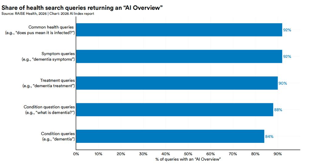 在五类主要查询类型中,平均有84%至92%的健康相关查询会触发谷歌的AI Overview,影响着大多数用户对所提问题的初步理解。