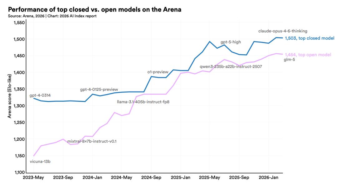 开源与闭源模型的性能差距在2024年短暂收窄后,2025年再度扩大。截至2026年3月,头部闭源模型领先开源模型3.3%;Arena排行榜前10模型中,6款为闭源模型。