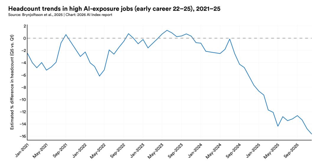 在就业市场22-25岁软件开发者的就业率较2024年下降近20%。