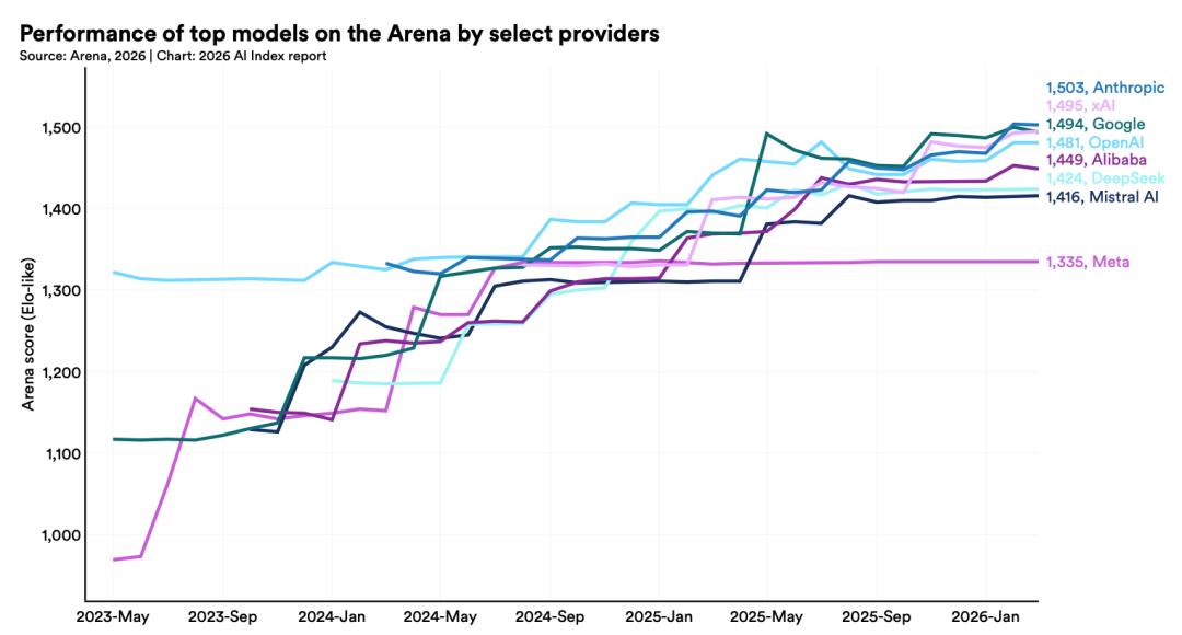 截至2026年3月,在Arena Leaderboard的人类投票评估中,Anthropic、xAI、谷歌、OpenAI四家头部厂商的模型Elo分差不足25,阿里巴巴、DeepSeek等紧随其后。性能差距收窄后,行业竞争焦点从基准跑分转向成本、延迟、可靠性、垂直领域优化等工程化能力。