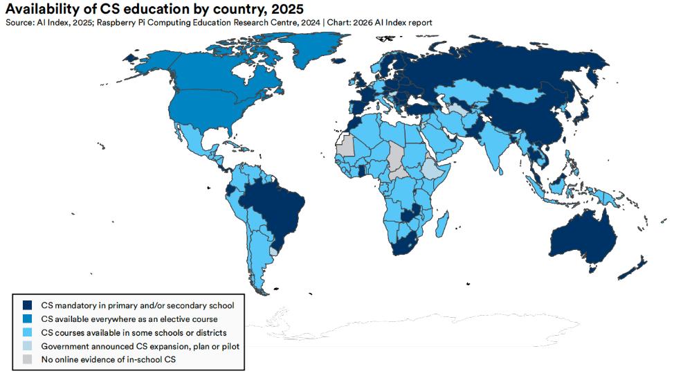 目前超过90%的国家已向中小学生提供计算机科学教育,但AI教育的普及速度较慢,其中,在中国,北京、广东和杭州在2025年5月发布的《中国中小学人工智能教育通识指南(2025年版)》和《中小学生生成式人工智能使用指南(2025年版)》之后,均于2025-26学年开始要求开展AI教育。