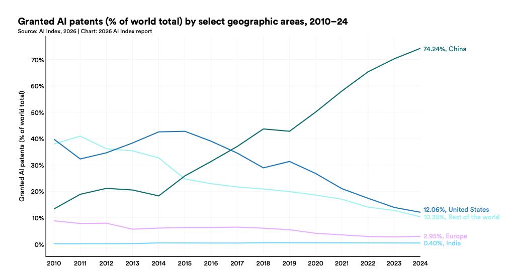 全球已授权AI专利数量从2010年的3866件飙升至2024年的131121件。2023-2024年,授权专利量同比增长8.2%。其中,中国占据全球绝对主导地位,占全球总量的74.2%,美国占比12.1%位居第二。