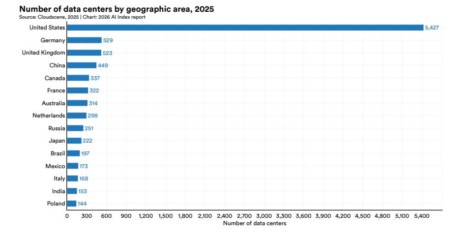 2025年美国运营5427个数据中心,数量是其他任何国家的10倍以上;德国529个、英国523个、中国449个紧随其后,其余多数国家的数据中心数量均不足300个。