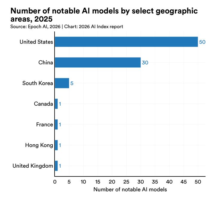 2025年,超过90%的标杆AI模型由企业打造,报告显示,2025年美国共发布50个标杆AI模型,位居全球第一;中国发布30个,位列第二;韩国发布5个,加拿大、法国、中国香港、英国各发布1个。