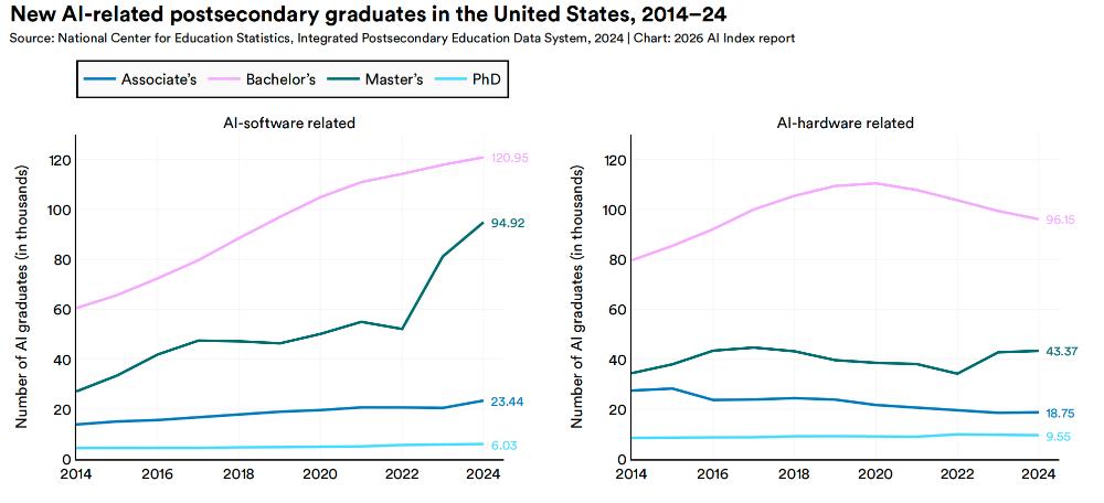 2024年至2025年间,美国四年制大学的计算机科学入学人数下降了11%,但AI相关研究生项目持续增长。