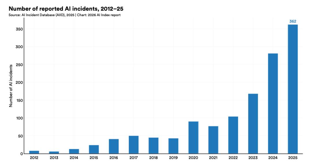 几乎所有前沿模型厂商,都会披露MMLU、SWE-bench等能力基准的结果,但负责任AI基准的报告率始终极低。且有记录的AI安全事件持续攀升,AI事件数据库2025年记录362起,2024年为233起。