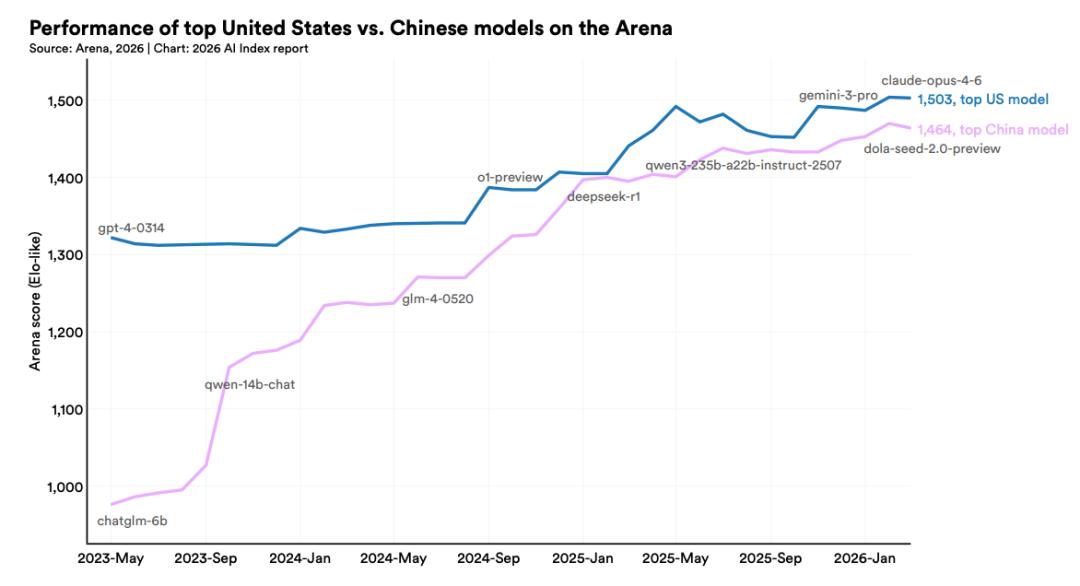 2025年2月,DeepSeek-R1仅以0.4%的差距落后于当时领先的美国o1-2024-12-17。截至2026年3月,美国Claude Opus 4.6领先字节的Dola-Seed-2.0 Preview,差距为2.7%。