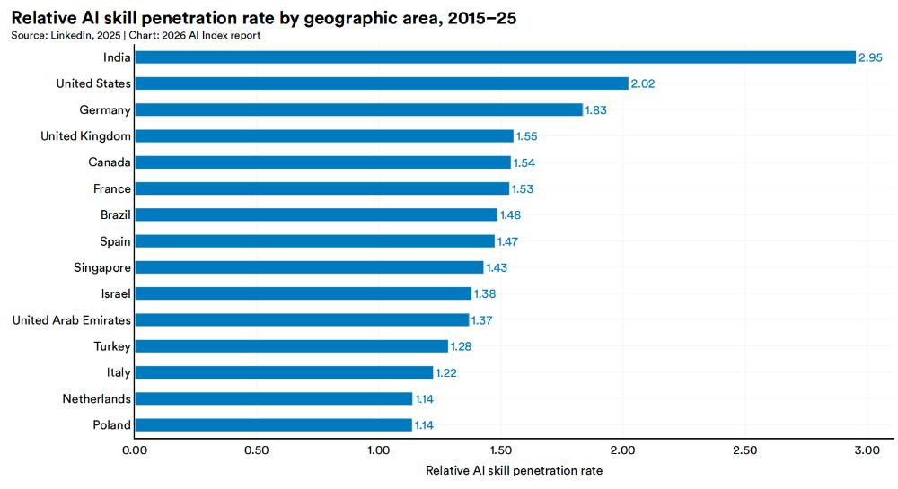 根据领英数据,印度用户最喜欢在个人资料中体现AI技能,以3.0的渗透率领先,意味着其会员个人资料中AI技能的出现频率几乎是全球平均水平的三倍,其次是美国(2.0)和德国(1.8)。