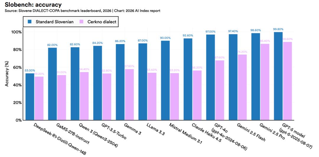 在斯洛文尼亚常识推理测试中,多款顶尖模型用区域方言测试时,准确率较标准语版本下跌近50%。