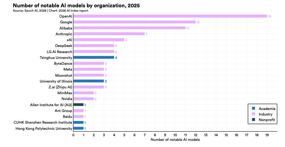 在产业界,2025年全球顶尖模型贡献方为OpenAI(19个)、谷歌(12个)、阿里巴巴(11个),在学术界,过去十年产出最丰硕的机构为清华大学(26个)、斯坦福大学(26个)、卡内基梅隆大学(25个)。