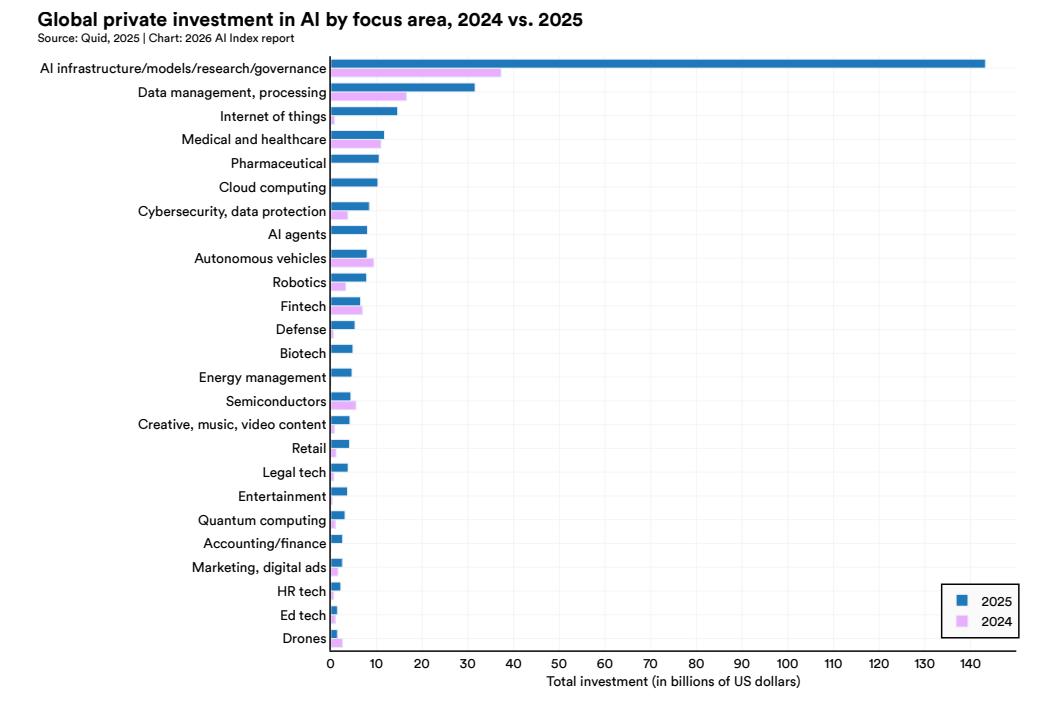 此外,2025年AI初创企业私募投资按赛道拆分显示,资本大幅向AI基础设施搭建与规模化的上游环节倾斜。
