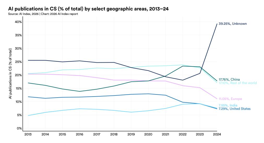 2024年,中国以17.8%的AI出版物占比位居全球第一,欧洲为11.1%,印度为7.6%;在AI论文引用量上,中国同样以20.6%的占比领跑,欧洲19.5%、美国为12.6%。