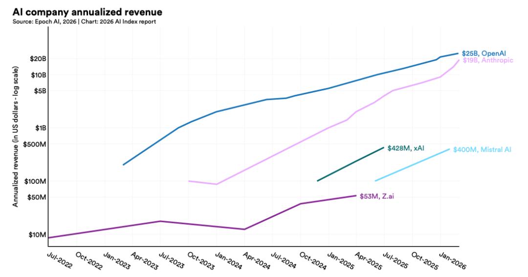 如下图所示,OpenAI、Anthropic、xAI、Mistral AI、智谱等头部AI企业的年化营收估算,在近年实现了快速增长。