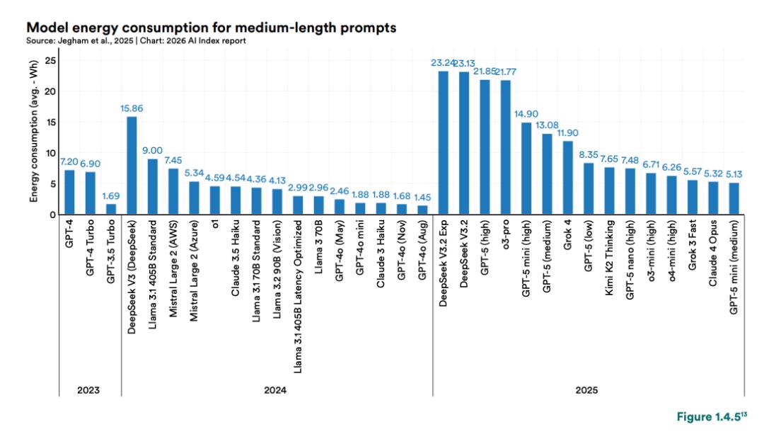 推理环节,2025年能耗排名前15的模型中,DeepSeek V3.2 Exp与DeepSeek V3.2单查询能耗最高,达23Wh;GPT-5(high)以21.9Wh紧随其后。即使同年发布的模型,能耗与碳排放也存在巨大差异,这表明推理能效存在显著分化,模型能力强弱与环境成本并非正相关。