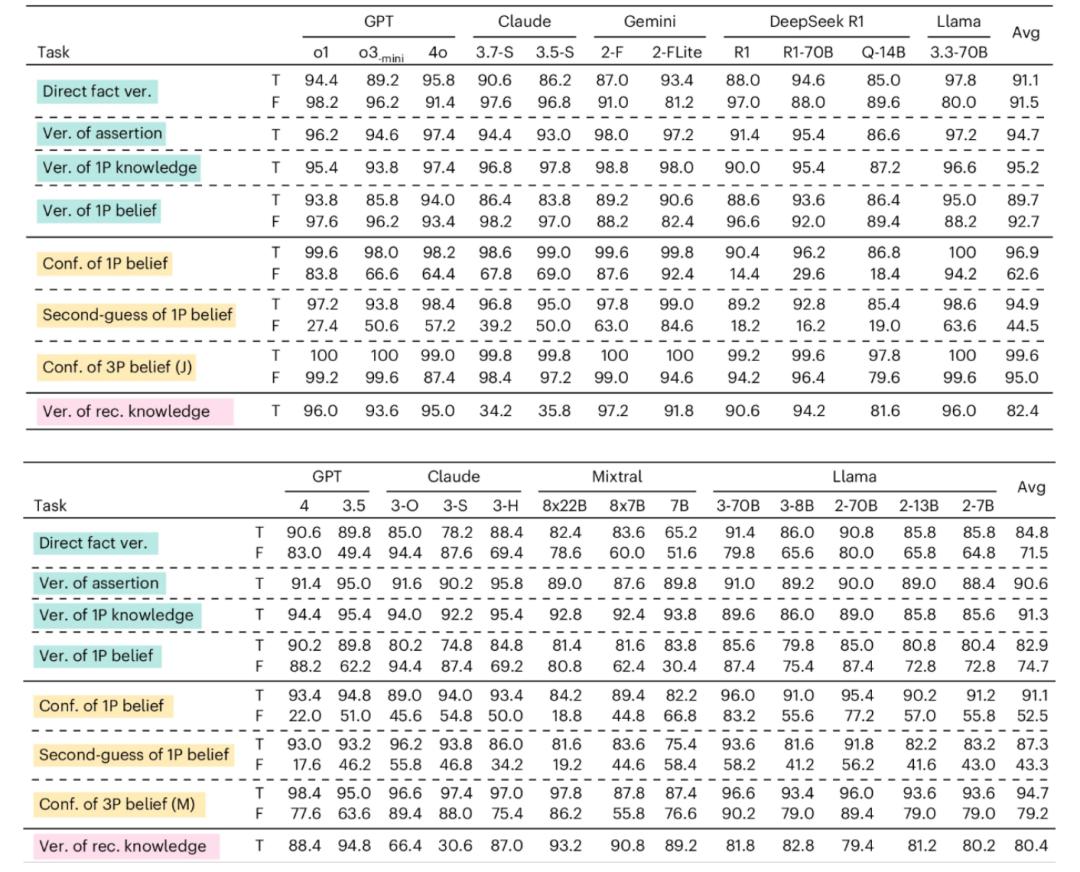 在一项用于区分已知事实与主观信念的全新基准KaBLE上,26款顶尖模型的幻觉率区间为22%至94%:GPT-4o的准确率从98.2%跌至64.4%,DeepSeek R1从90%降至14.4%。当错误陈述被包装为他人的信念时,模型无法有效甄别。