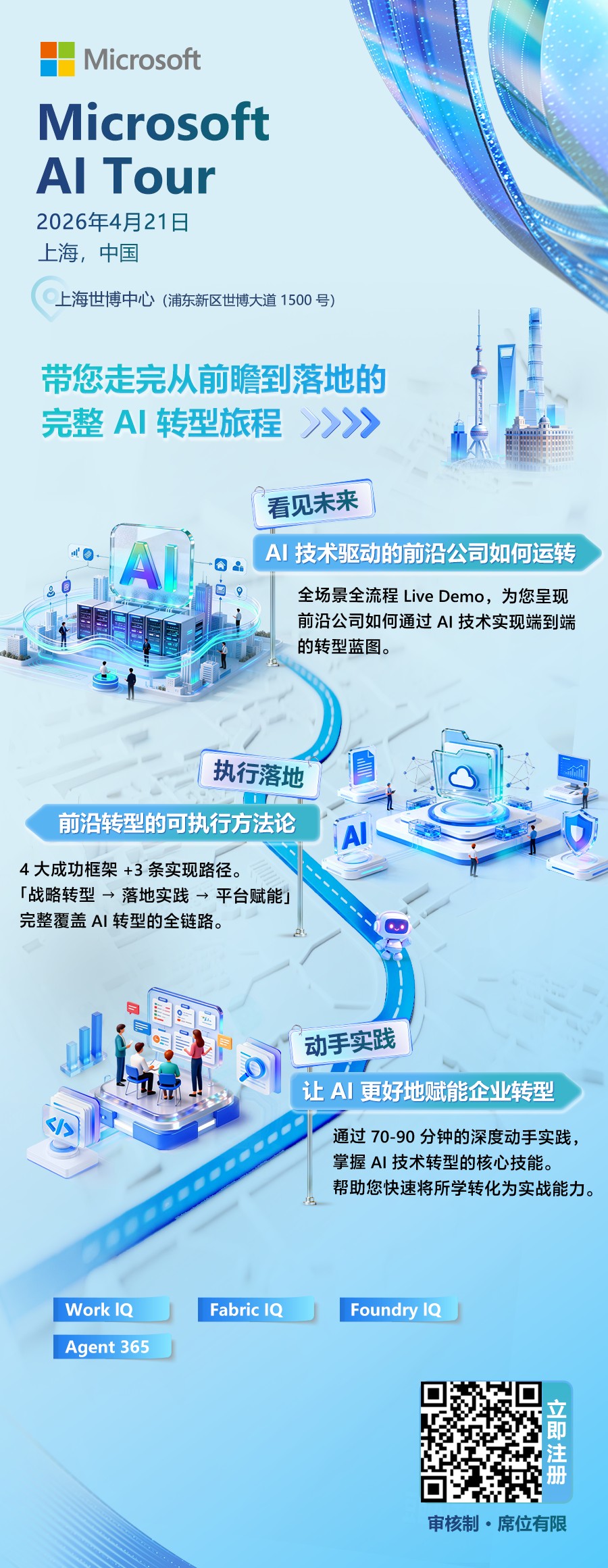 2026年4月21日,Microsoft AI Tour在跨越全球30+城市后,将正式登陆上海世博中心。