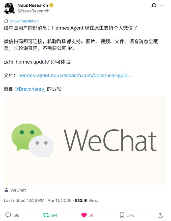 还不单单是这样,Hermes Agent的开发者Nous Research宣布推出微信功能的时候,使用的还是中文,大大刷了一波中文社区的好感度。