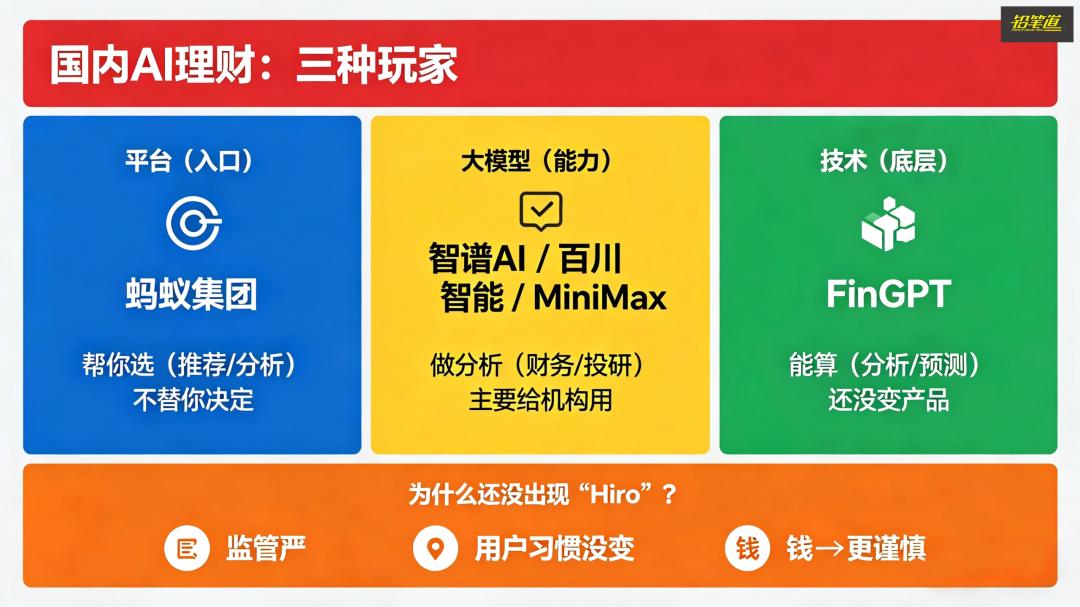 背后的原因也很现实。一是金融监管严格,AI不能随便给投资建议;二是用户习惯在支付宝、银行里理财,不太会单独下载一个新App;三是涉及钱,大家会更谨慎,信任门槛更高。
