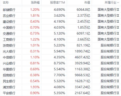 截至4月14日,国有大行里,交行股息率5.12%、邮储4.69%、工行4.1%、建行4.19%,A股普遍都在4%以上,H股更是能达到5%以上。