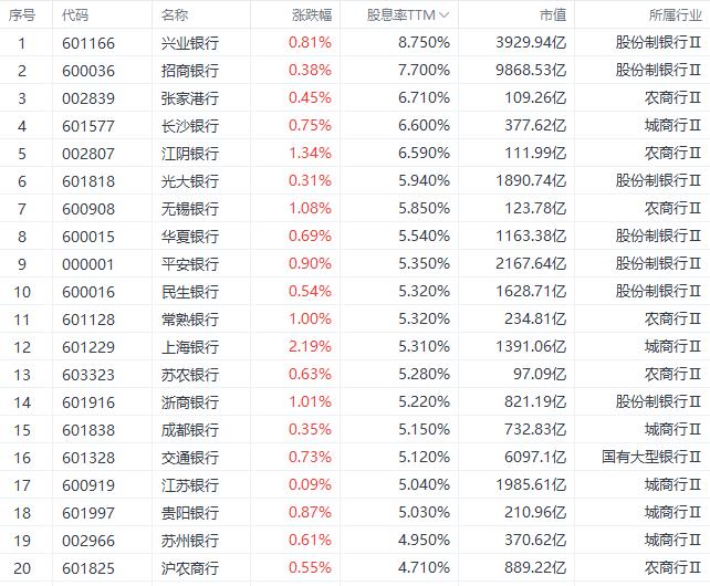 截至4月10日,Wind数据显示,A股上市银行里,90%以上的TTM股息率都超过了4%,还有15家以上突破了5%。