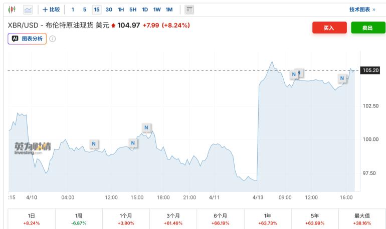 随着霍尔木兹海峡再次关闭,4月13日,国际油价再次突破每桶100美元。截至北京时间17时23分,5月交货的WTI原油价格报每桶104.51美元,涨幅为7.94%。布伦特原油现货的价格报每桶105.97美元,上涨7.99%。