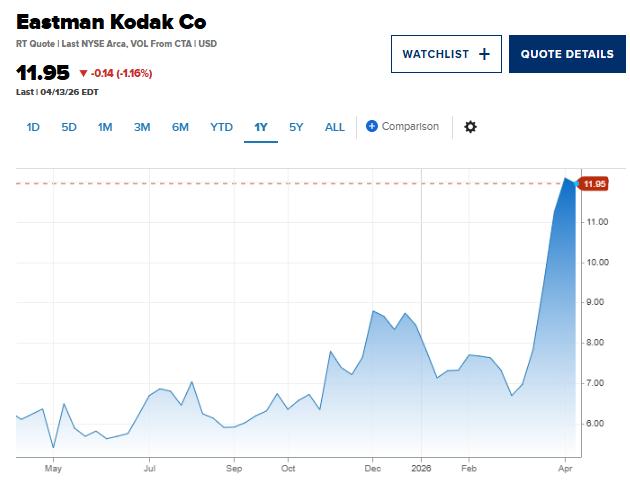 曾经的胶卷巨头——伊士曼柯达公司(Eastman Kodak Company)的股价上周触及每股12.46美元,创下52周新高,累计涨幅接近100%,而在约一年前,这只股票还在4.94美元的历史性低位徘徊。