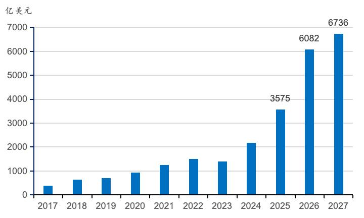 图1 四家超大规模运营商的资本支出 数据来源:2017-2025年数据根据财报整理得到,2026-2027年数据来自彭博社,为华尔街的平均预测值。其中,微软为财年数据。