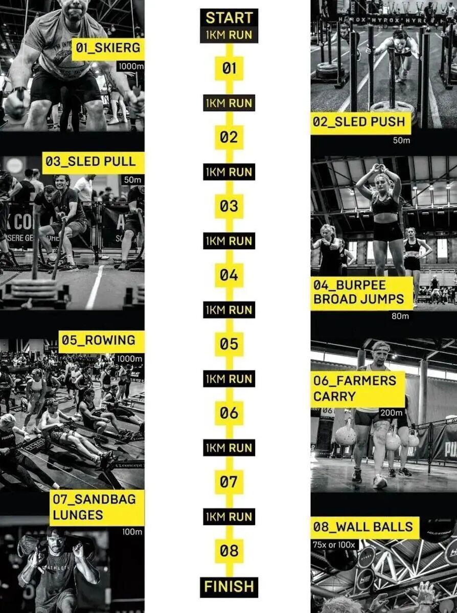 这个2017年诞生于德国汉堡的小众赛事,以“FOR EVERY BODY”为宗旨。从具体操作上来说,HYROX可以称得上是一场包含“8个1公里跑+8个体能项目”的“找虐循环”。