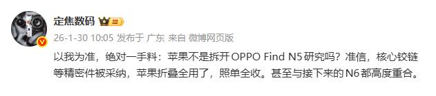此前,博主@定焦数码就曾爆料,苹果在研发时对OPPO Find N5进行了拆机研究,铰链、精密件被苹果照单全收,甚至与N6高度重合。