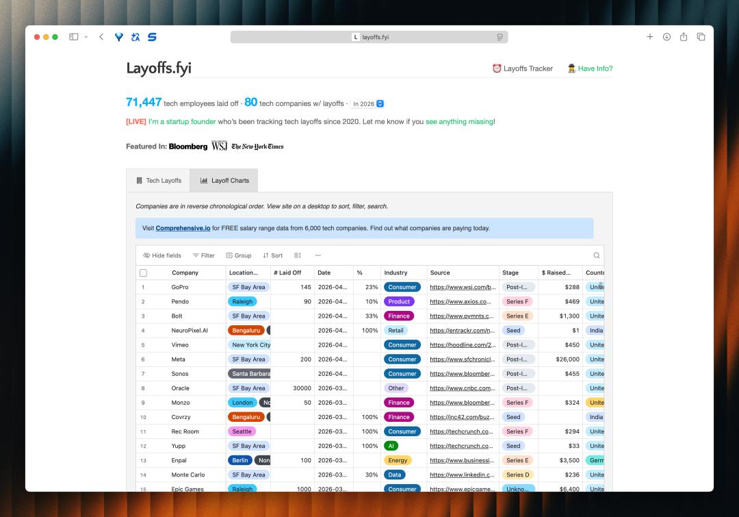 商业数据平台 RationalFX 统计称,今年第一季度全球科技行业裁员近 8 万人,约四分之三都发生在美国,近一半裁员都归因于人工智能及工作自动化影响。追踪科技裁员规模的数据库 Layoffs.fyi 统计称,2026 年已有超 7 万名科技从业者被裁员,涉及 80 家公司。