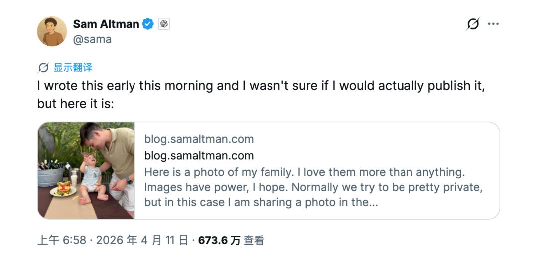 首次袭击发生后,萨姆·奥尔特曼对外发布博客长文呼吁人们保持冷静。他罕见地分享了一张家人照片,他的伴侣和他的孩子,“Here is a photo of my family, I love them more than anything. ”他说,他相信照片是有力量的,希望它能阻止下一个朝他家里扔燃烧瓶的人。