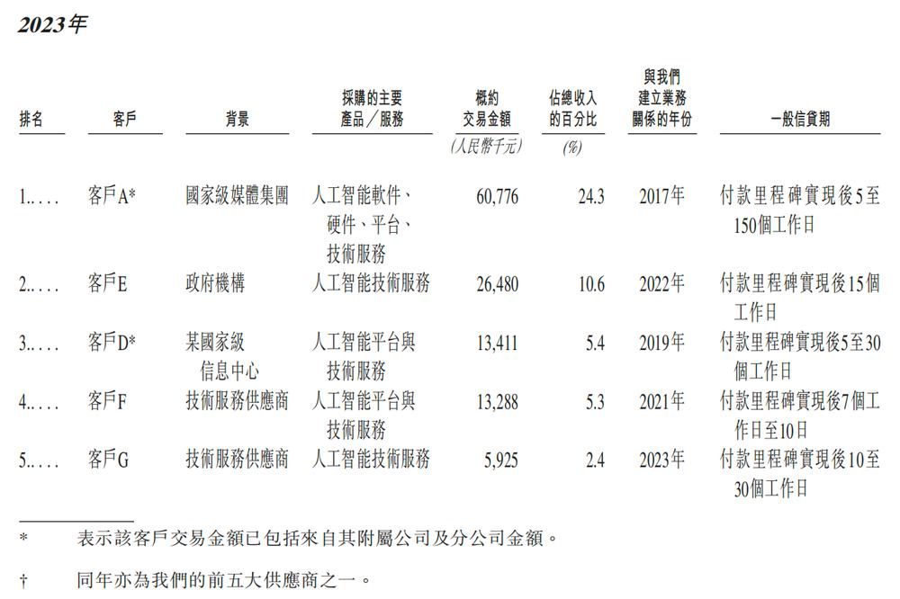 2023年、2024年及2025年,中科闻歌从最大客户获得的收入占比分别为24.3%、19.9%和19.1%,对应金额分别约为0.61亿元、0.63亿元和0.78亿元;从前五大客户获得的收入占比分别为48.0%、32.5%和37.6%,对应金额分别约为1.20亿元、1.03亿元和1.52亿元。