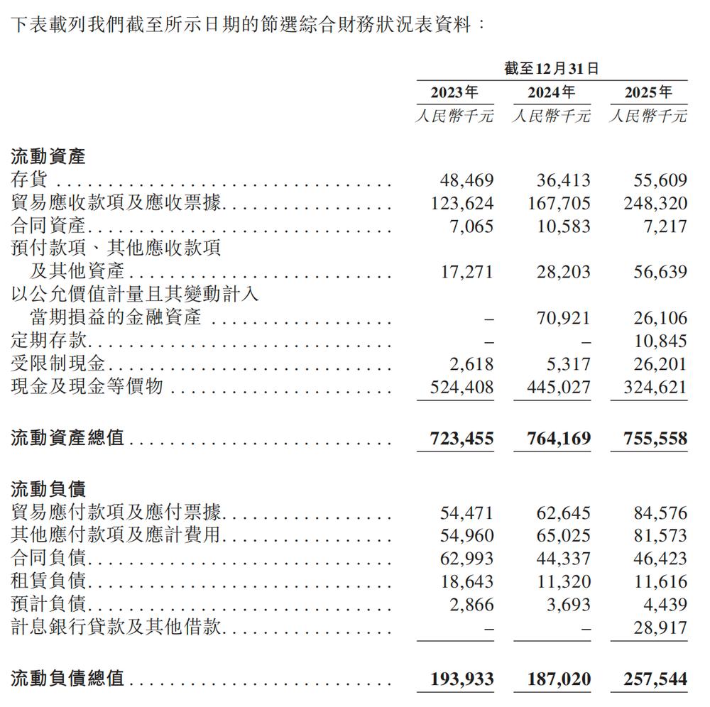 中科闻歌账上现金较为充足,但呈下降趋势。2023年至2025年,其现金及现金等价物分别为5.24亿元、4.45亿元和3.25亿元,持续减少。与此同时,应收账款规模明显增长,同期贸易应收款项由1.24亿元增长至2.48亿元,两年翻倍。