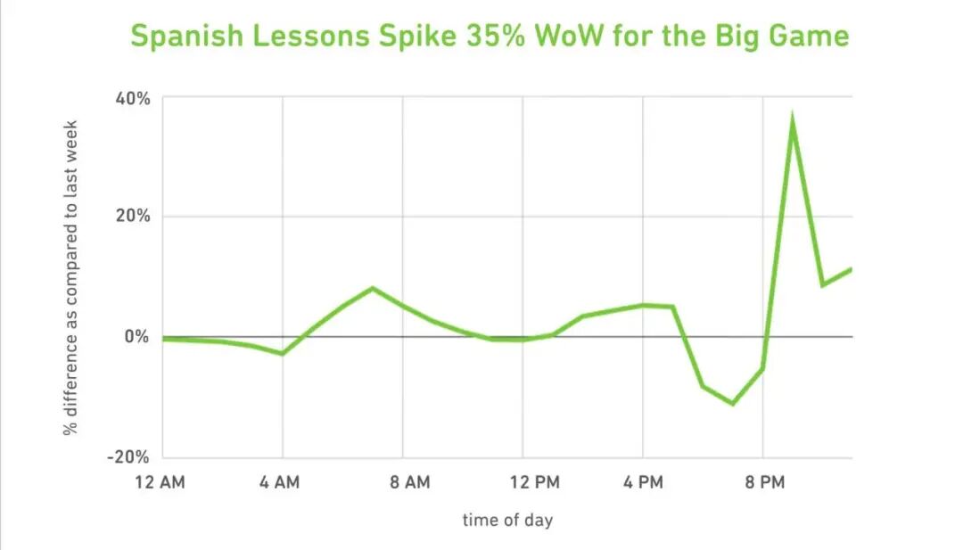 超级碗当天,学习西语人数的增长幅度大幅提升|图片来源:Duolingo