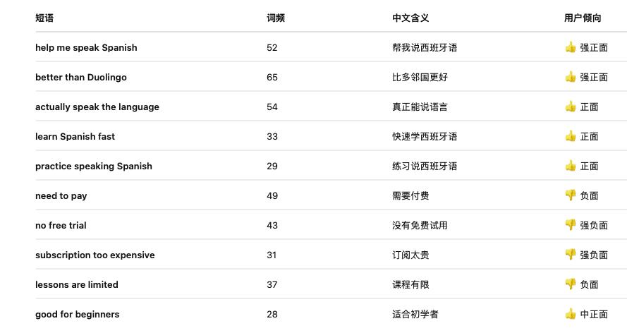 回看美国的这次增长,我们在用户评论中找到了相关痕迹,美国用户使用 Speak 的原因是开口说西班牙语,用户评论中“Spanish”出现频次非常高,且基本与“Speak/Practice”等关键词绑定出现。