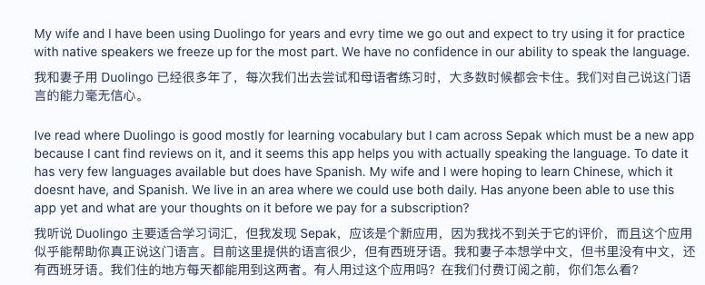 而另一个高频出现的词是 Duolingo,“better than Duolingo”短语出现了 66 次,排名第二。而在 Reddit 上,有用户现身说法,他表示自己和妻子用 Duolingo 学了好几年西班牙语,但出门真的遇到西语母语者,大多时候都会卡住,对自己说这门语言毫无信心,希望尝试一下 Speak。