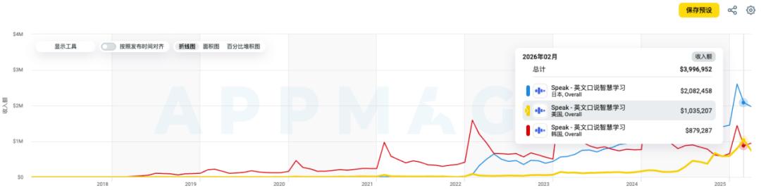 但今年,Speak 的一个明显变化是,除了日韩 2 个主力市场之外,美国市场流水增幅尤其大,2 月美国分成后收入已超过爱学英语的韩国,成为 Top2 收入市场。
